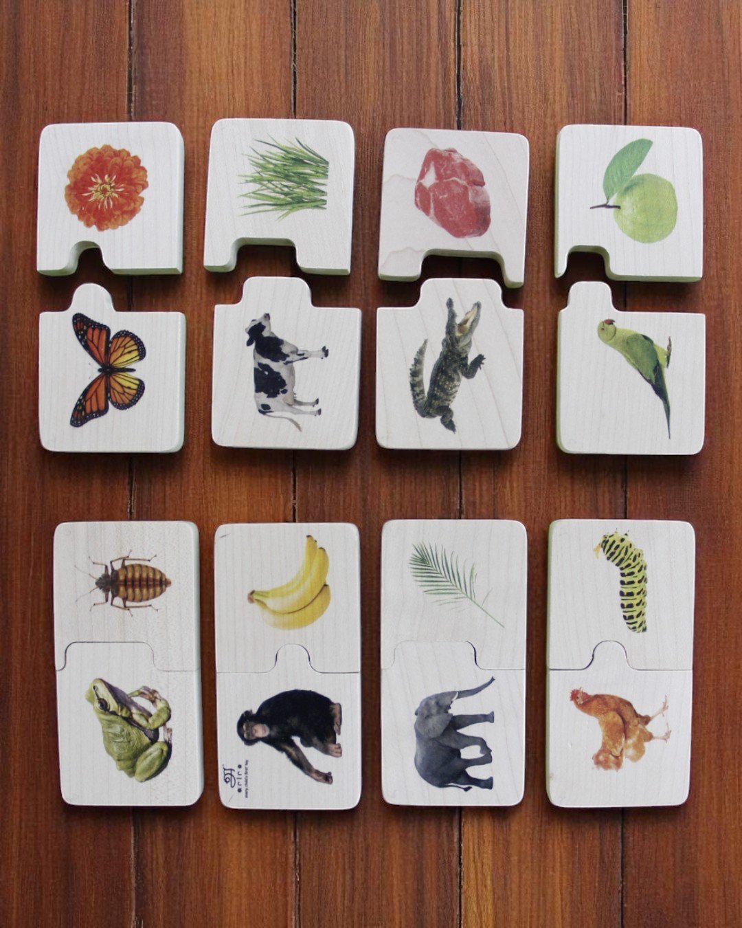 16 Chunky Puzzles (Monkey-Banana, Elephant-Grass, Butterfly-Flower, Frog-Bug, Parrot-Fruit, Cow-Grass, Hen-Caterpillar, Crocodile-meat)