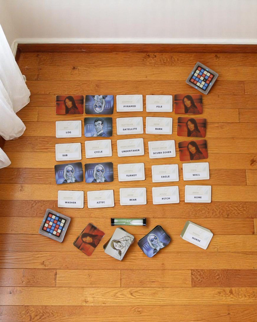 1 Instruction Manual; 8 Red Agent Cards; 8 Blue Agent Cards; 1 Double agent Card; 7 Innocent bystander Cards; 1 Assassin Card; 40 Key Cards; 1 Sand timer; 1 Plastic stand; 205 Double sided Codename Cards