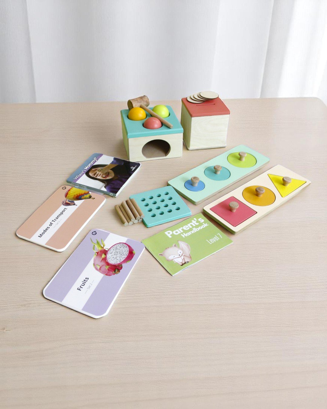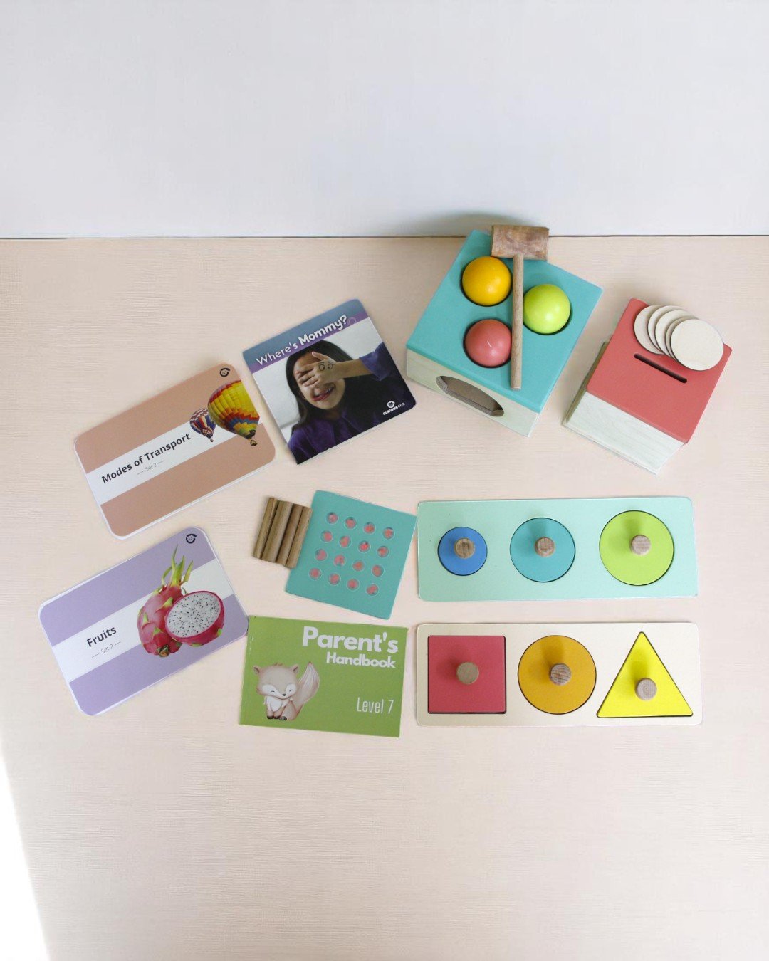 1 Parent Handbook; 1 Where’s Mommy Book; Flash Cards – Fruits (Fig, Custard Apple, Peach, Sapodilla, Watermelon, Starfruit, Blueberry, Strawberry, Orange, Dragon Fruit); Flash Cards – Modes of Transport (Parachute, Hot Air Balloon, Kayak, Taxi, Truck, Scooter, Ship, Motorbike, Ambulance, Police car; 1 Wooden Coin & Peg Box with 2 Lids; 5 Wooden Coins; 7 Wooden Pegs; 1 Wooden Ball Hammer Box; 1 Wooden Hammer; 3 Wooden Balls (Orange, ink & Green); 1 Wooden Circle Seriation Puzzle with 3 Wooden Pegged Circle Puzzle Pieces; 1 Wooden Basic Shape Puzzle with 3 Wooden Pegged Basic Shape pieces
