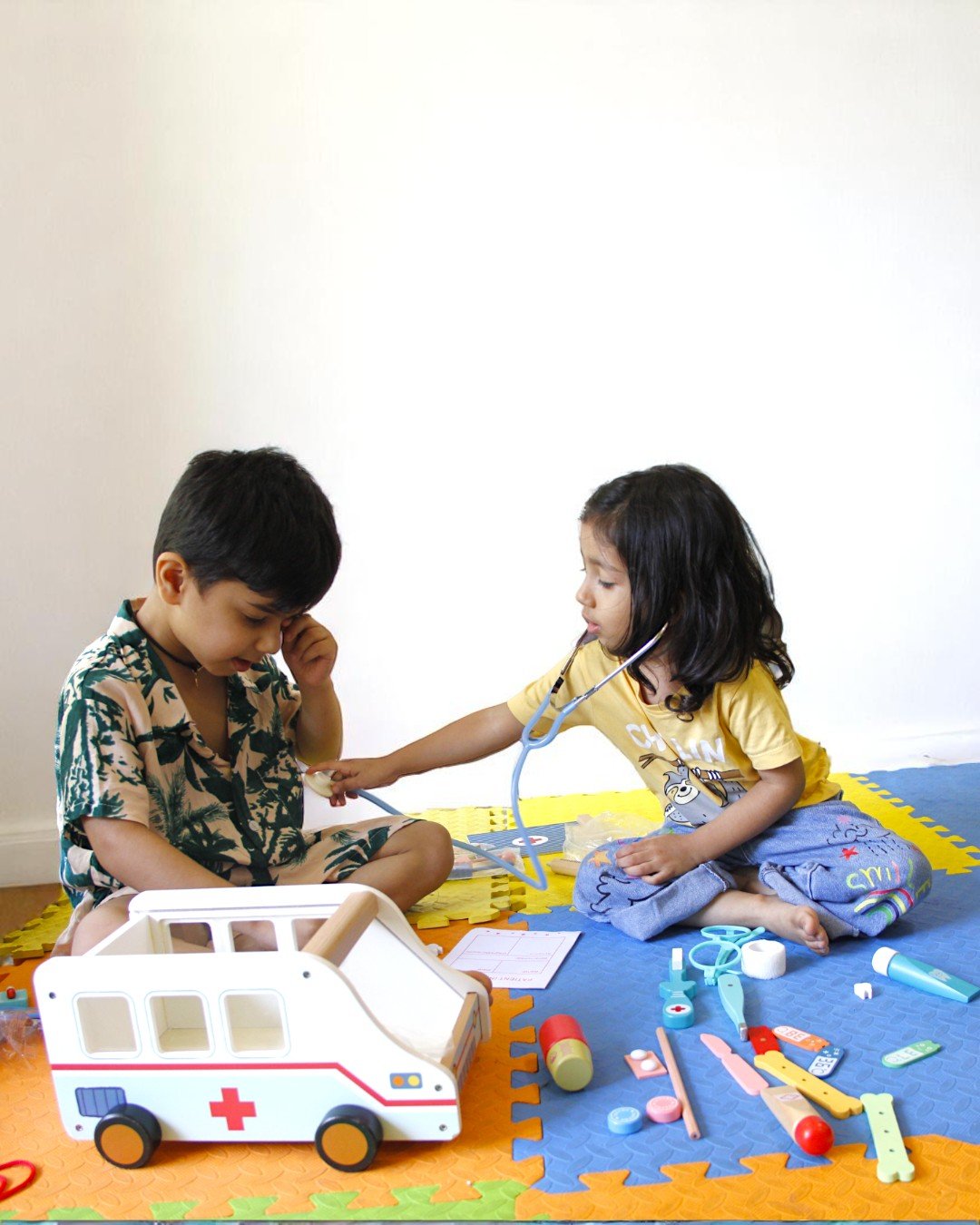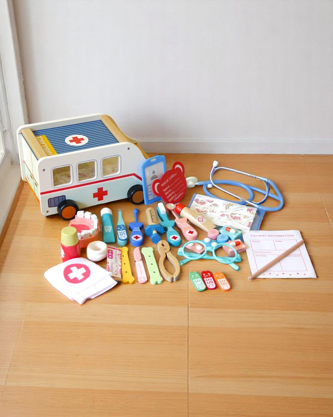 The Doctor Ambulance Set with a wooden ambulance offers a delightful blend of imaginative play and developmental benefits, providing children with a hands-on experience that fosters various essential skills. As young medical professionals engage in role-playing scenarios—transporting patients, administering care, or managing emergency situations—they enhance their creativity and imagination, crafting stories that reflect their understanding of the world around them. Manipulating the wooden ambulance and medical tools strengthens fine motor skills and hand-eye coordination, as children grasp, position, and move the components during play. This tactile interaction also supports sensory development, allowing children to explore different textures and shapes. Engaging in these role-play scenarios promotes social skills such as communication, cooperation, and empathy, as children collaborate with peers or family members, practicing shared responsibilities and understanding different perspectives. Additionally, the set introduces basic concepts of problem-solving and critical thinking, as children navigate medical scenarios and make decisions about patient care. The realistic design of the wooden ambulance and medical tools provides an authentic experience that can inspire interest in healthcare professions and encourage discussions about health and well-being. Furthermore, this pretend play set nurtures emotional development, helping children process and express their feelings about health-related topics in a safe and supportive environment. By integrating this set into their playtime, children not only enjoy endless hours of entertainment but also build a strong foundation for learning and personal growth.