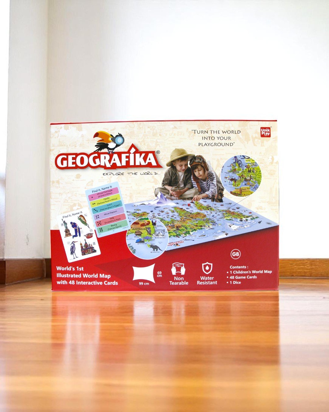 Geografika is a vibrant and enriching educational board game that invites children to explore the wonders of the world through fun and interactive learning. Featuring a large, illustrated world map filled with over 280 hand-drawn images representing countries, animals, landmarks, foods, sports, and cultural festivals, this game provides a visually engaging platform for enhancing geographical knowledge and world awareness. As children interact with the double-sided cards—designed for both beginners and advanced learners—they build reading comprehension, observation skills, and vocabulary development, while the act of matching images or text to locations on the map encourages memory retention and logical reasoning. Rolling the dice and moving through the gameplay enhances fine motor skills, hand-eye coordination, and turn-taking abilities, while also promoting critical thinking as players strategize their moves. The durable, non-tearable, and water-resistant map ensures repeated play, making it a reliable tool for long-term learning. Playing in a group fosters social interaction, communication skills, and teamwork, allowing children to learn in a collaborative and joyful environment. Overall, Geografika transforms the study of geography into an exciting global adventure that strengthens essential cognitive and social skills while igniting curiosity about the world.