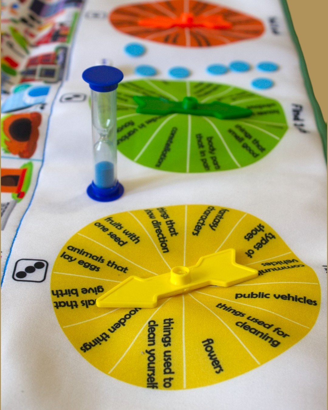 1 Sand Timer; 1 Playing Dice; 7 Blue coins; 1 Plastic Box; 1 I Spy Mat with 6 Prefixed Spinners