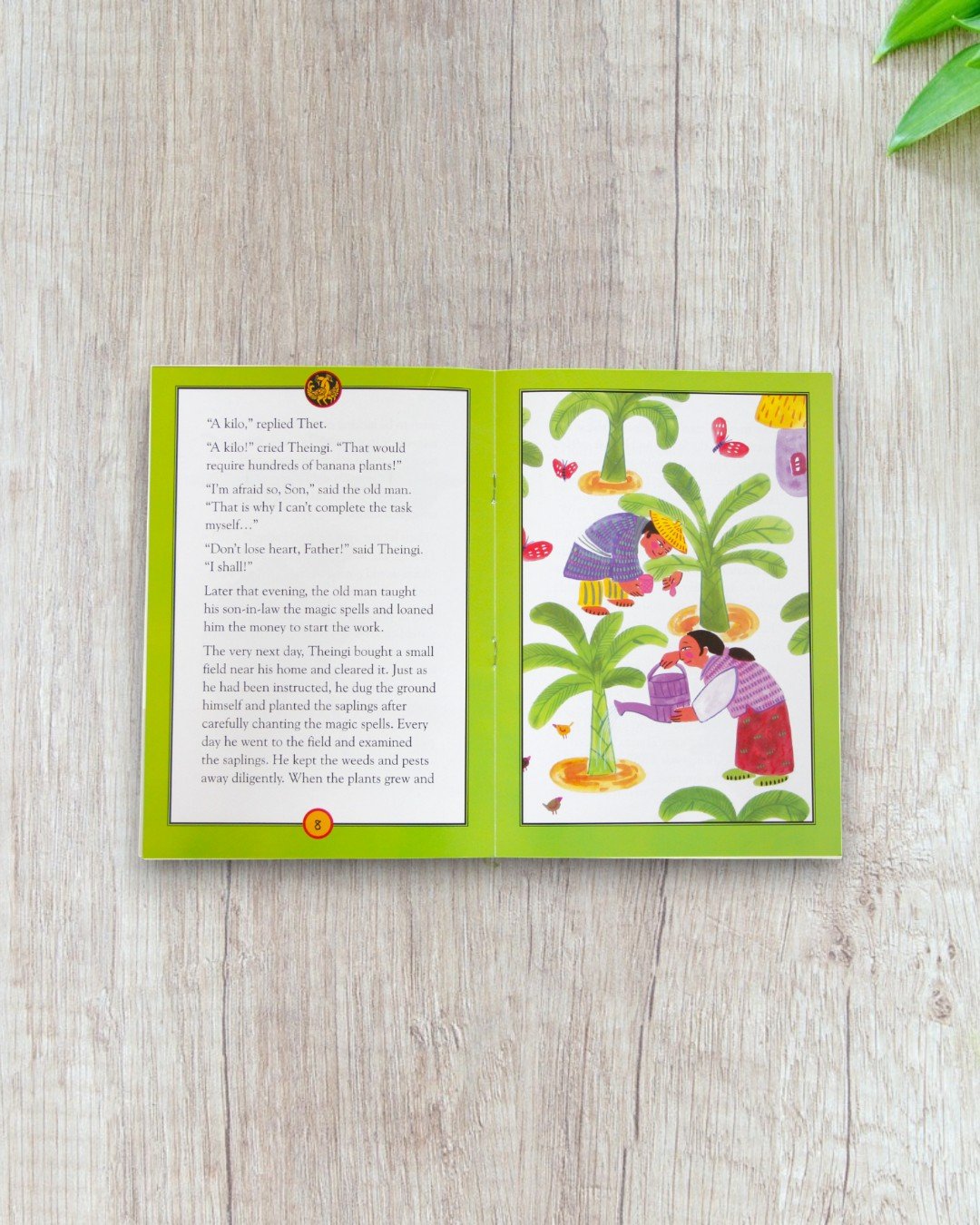 Set in a quaint village along the Irrawaddy River, the tale follows Thuza and her husband, Theingi. While they lead a contented life, Theingi becomes obsessed with the idea of transforming dirt into gold using a mysterious “magic powder.” His relentless pursuit of this dream leads to unforeseen consequences, ultimately imparting a valuable lesson about the virtues of hard work and the perils of chasing illusions. Recommended age – 5+ Years