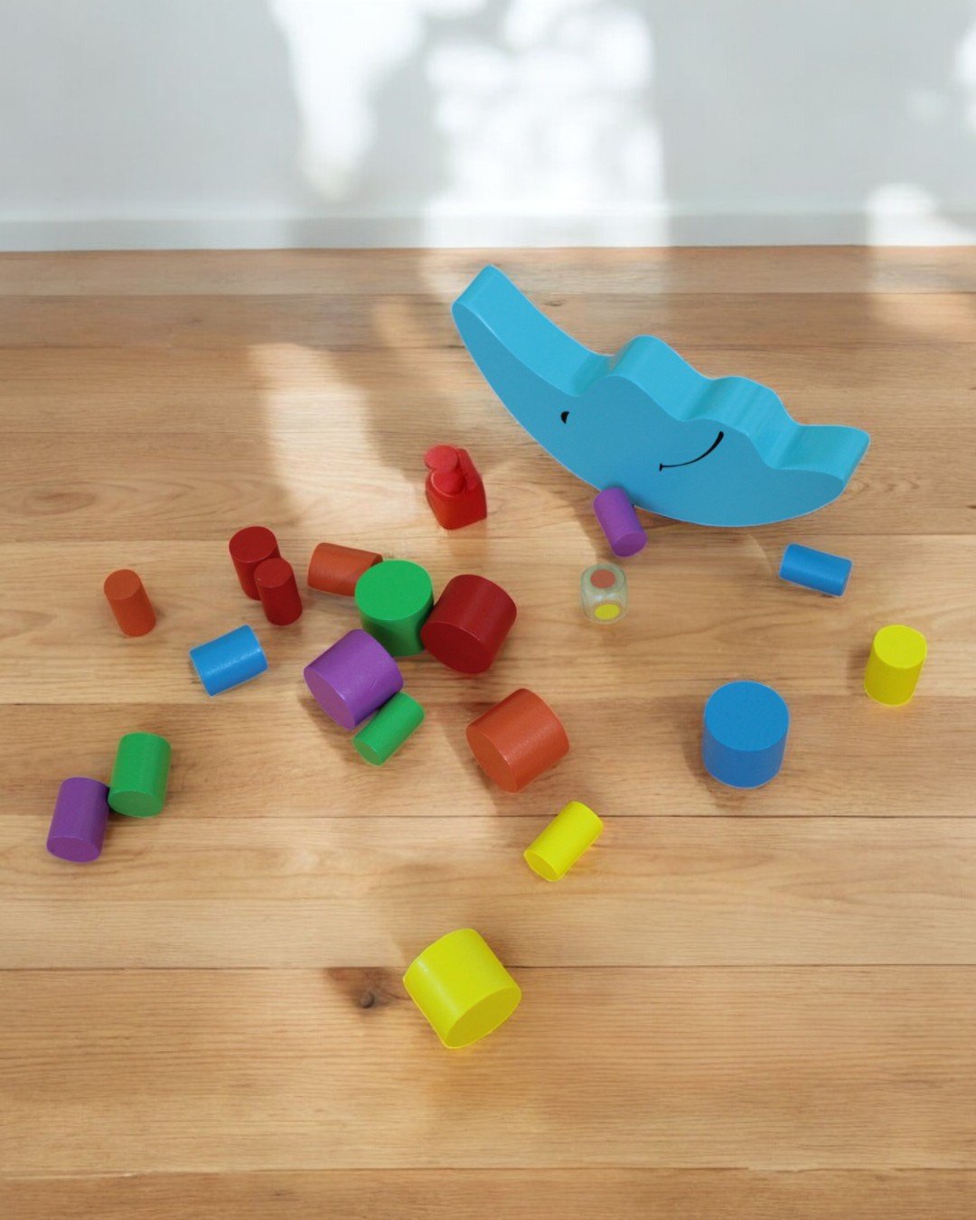 1 Wooden Blue Base; 1 Playing die; 18 Wooden cylinders (3 Blue, 3 Green, 3 Blue, Yellow, 3 Orange & 3 Purple)
