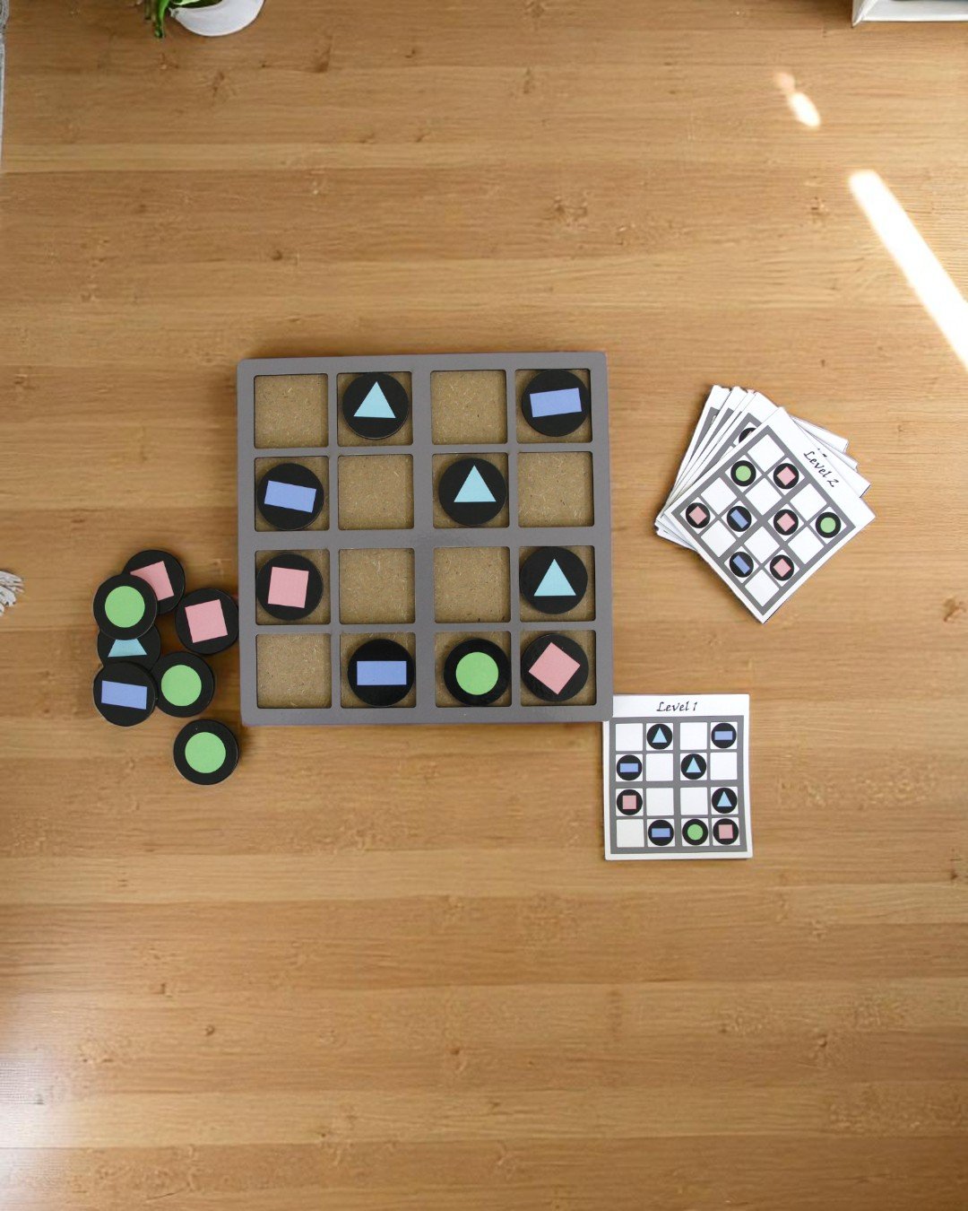 A shape sudoku set is a stimulating and educational activity that introduces children to early logic and pattern-based reasoning through engaging, hands-on play. As children analyse the puzzle and place different shapes into the correct spaces without repeating them in rows, columns, or blocks, they enhance their problem-solving and logical thinking skills, learning to observe, compare, and strategize. Manipulating the physical pieces helps strengthen fine motor skills and hand-eye coordination, encouraging precise control and thoughtful placement. The activity supports shape recognition and visual discrimination, as children learn to identify and differentiate between various forms. Completing a shape sudoku puzzle requires sustained concentration and focus, helping children build attention span and mental stamina. It also reinforces spatial awareness, as they visualize the arrangement of shapes across the puzzle grid. With each successful solution, children experience a boost in self-confidence and develop perseverance, learning to approach challenges with patience and determination. Overall, shape sudoku is a fun and rewarding way to nurture cognitive development through interactive and meaningful play.