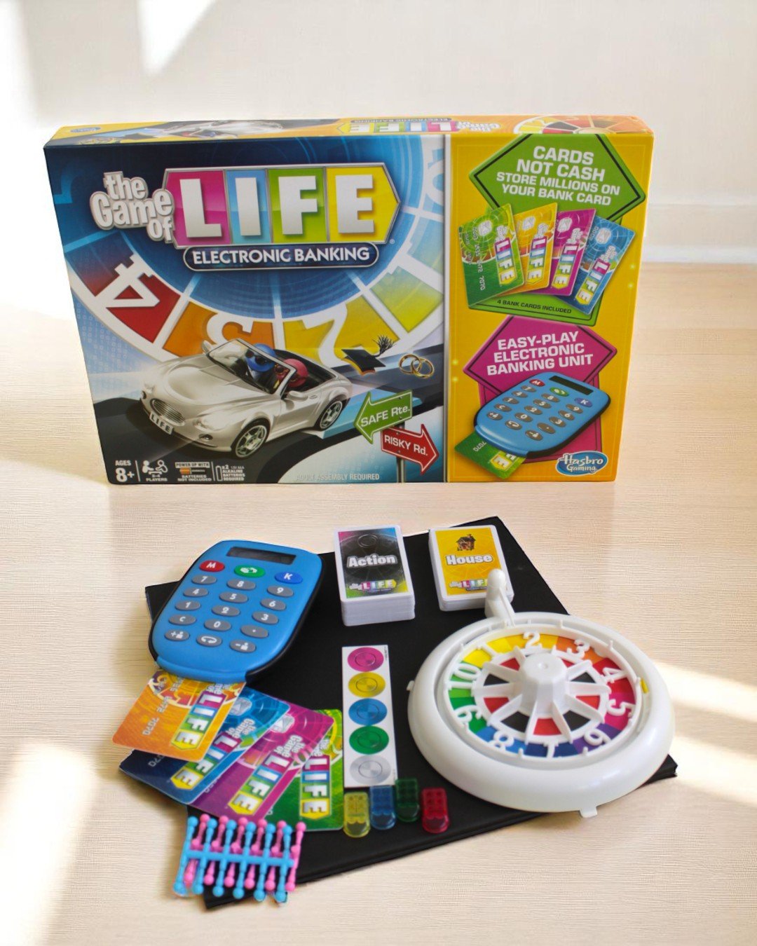1 Instruction Manual; 1 Game Board; 1 Banking Unit; 1 Spinner; 4 ATM debit cards; 62 Action Cards; 14 House Cards; 7 Career Cards; 7 College Career Cards; 5 Playing Tokens; 4 Playing Cars; 24 People Pegs (12 Blue & 12 Pink)
