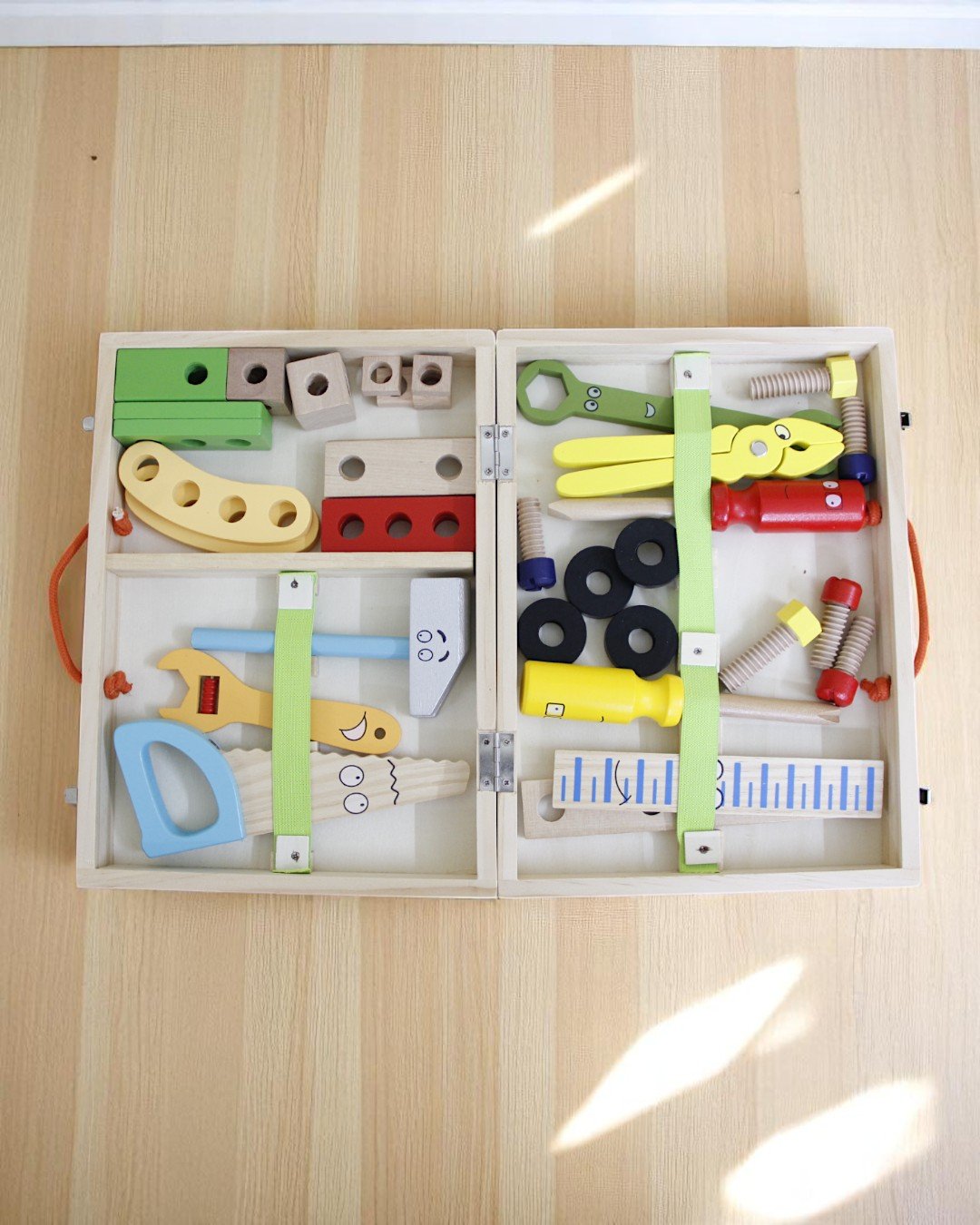 1 Wooden Tool box; 1 Wooden scale; 1 Wooden Screw driver; 1 Wooden Spanner; 1 Wooden Cutting Plier; 1 Wooden Saw; 1 Wooden Hammer; 1 Adjustable Wrench; 1 Instruction Manual; 4 Black wheels; 6 Screws (2 Blue, 2 Red & 2 Yellow); 6 small wooden square with screw cavities; 4 Rectangles with 3 cavities each (2 Green & 2 Red); 2 Wooden Rectangles with 2 cavities each; 1 Wooden Rectangle with 4 cavities; 2 Wooden Cubes; 1 Green wooden cuboid; 2 Yellow arches with 4 cavities each